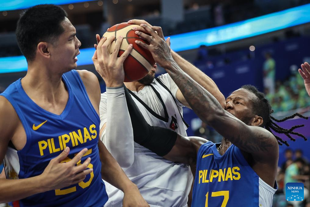 Justin Brownlee (C) of Philippines competes during the Men's Preliminary Round Group match of Basketball between Jordan and Philippines at the 19th Asian Games in Hangzhou, east China's Zhejiang Province, Sept. 30, 2023. (Xinhua/Pan Yulong)