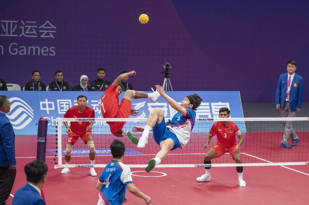 Photo shows a men's sepak takraw game between Indonesia and South Korea at the 19th Asian Games in Hangzhou, east China's Zhejiang province, Sept. 24, 2023. (Photo by Hu Xiaofei/People's Daily Online)