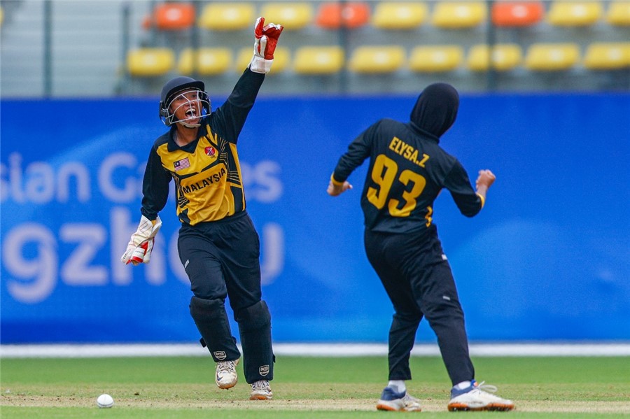 Photo shows Malaysian athletes in a 1/4 final of the women's cricket at the 19th Asian Games in Hangzhou, east China's Zhejiang province, Sept. 21, 2023. (Photo from the official website of the Hangzhou Asian Games)