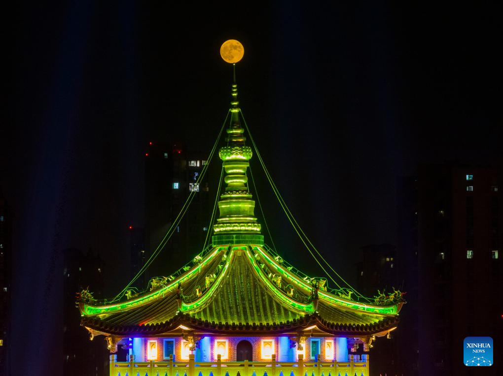 A full moon is seen from the Haigang District of Qinhuangdao, north China's Hebei Province, Sept. 29, 2023. Friday marks this year's Mid-Autumn Festival. People across China admire the full moon to celebrate the traditional holiday. (Photo by Cao Jianxiong/Xinhua)