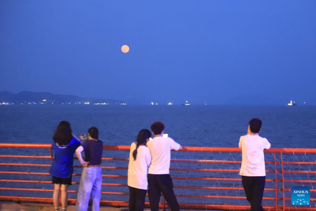 People view a full moon by the seaside of Zhoushan, east China's Zhejiang Province, Sept. 29, 2023. Friday marks this year's Mid-Autumn Festival. Chinese people have a tradition to celebrate the festival by admiring the full moon. (Photo by Xing Shoumiao/Xinhua)