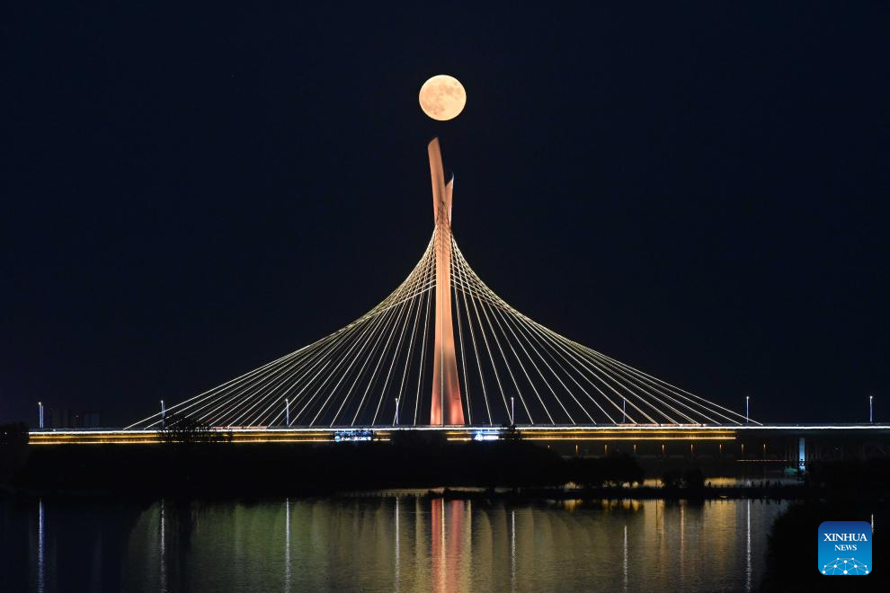 A full moon is seen over the Hutuo River grand bridge in Shijiazhuang, north China's Hebei Province, Sept. 29, 2023. Friday marks this year's Mid-Autumn Festival. Chinese people have a tradition to celebrate the festival by admiring the full moon. (Photo by Chen Qibao/Xinhua)