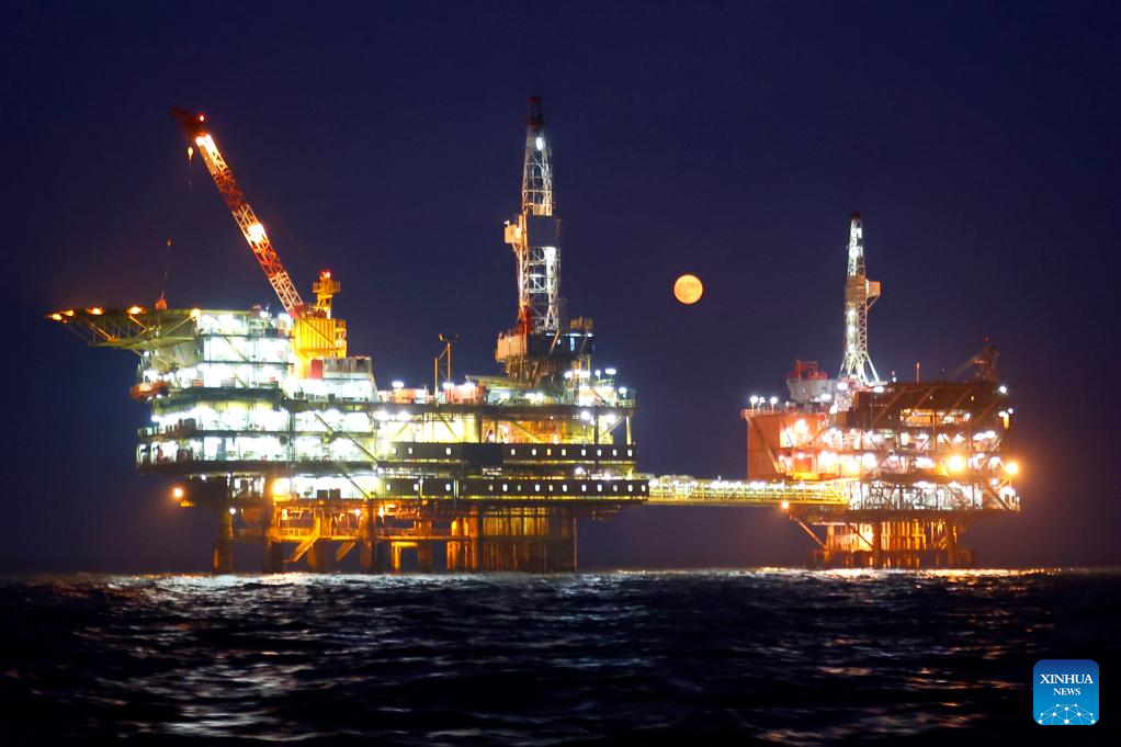 A full moon is seen over an oil production platform in Bohai Oilfield, Sept. 29, 2023. Friday marks this year's Mid-Autumn Festival. Chinese people have a tradition to celebrate the festival by admiring the full moon. (Photo by Du Penghui/Xinhua)