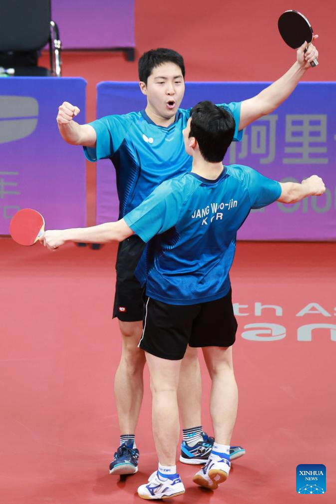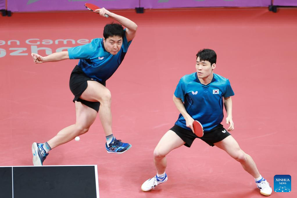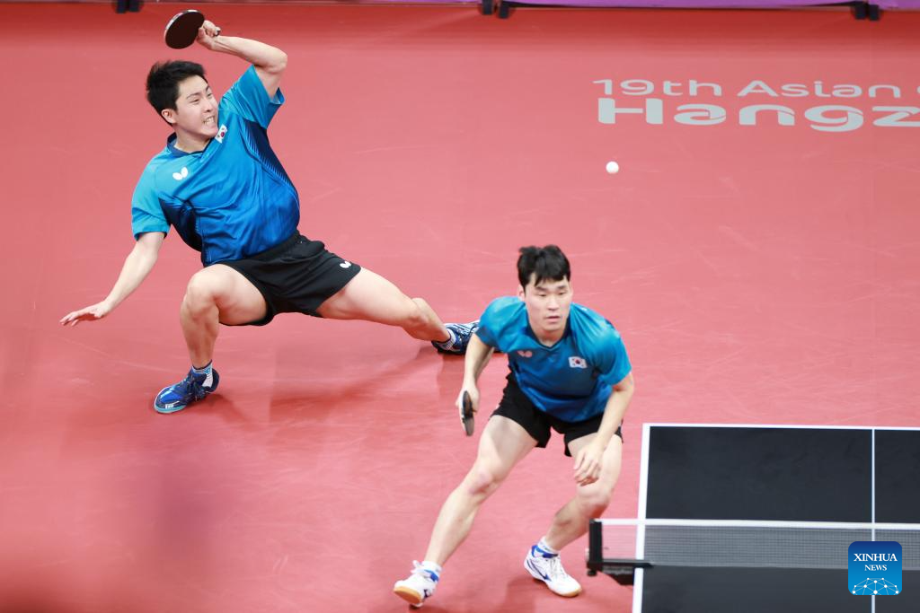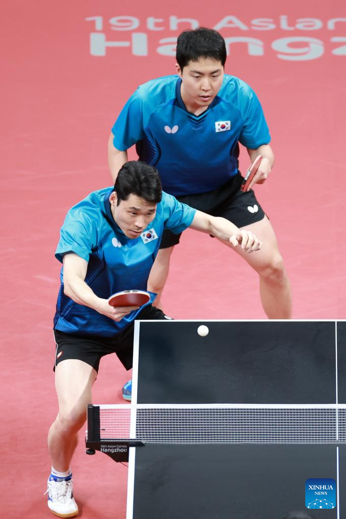 Jang Woojin/Lim Jonghoon (L) of South Korea compete during the Men's Doubles Semifinal of Table Tennis between Jang Woojin/Lim Jonghoon of South Korea and Chuang Chih-Yuan/Lin Yun-Ju of Chinese Taipei at the 19th Asian Games in Hangzhou, east China's Zhejiang Province, Oct. 1, 2023. (Xinhua/Liu Xu)