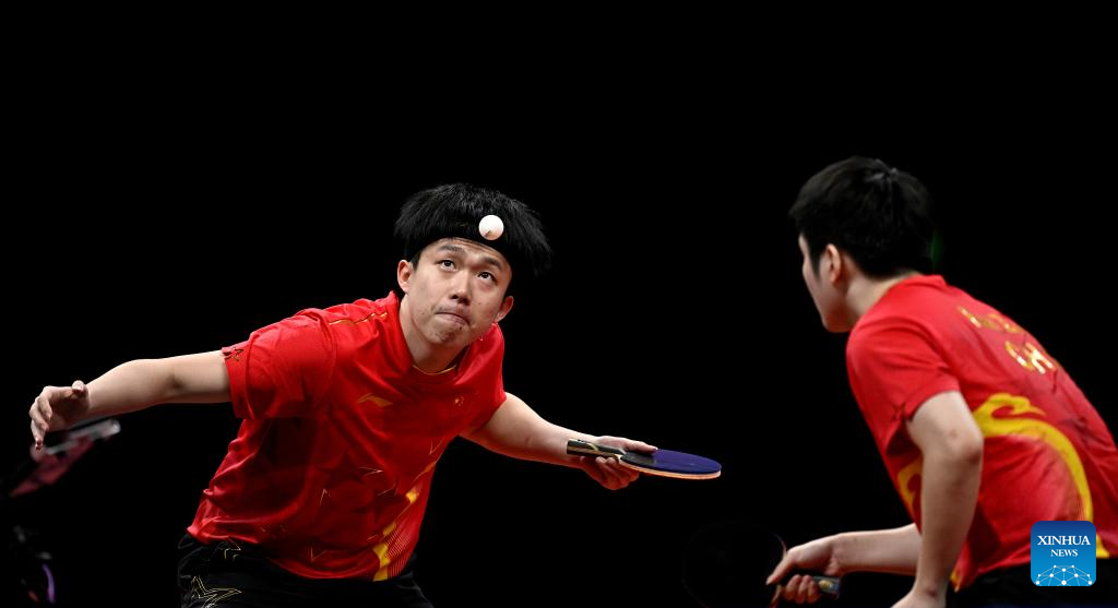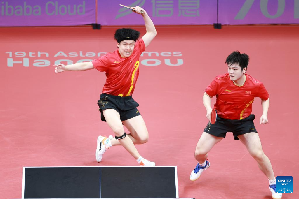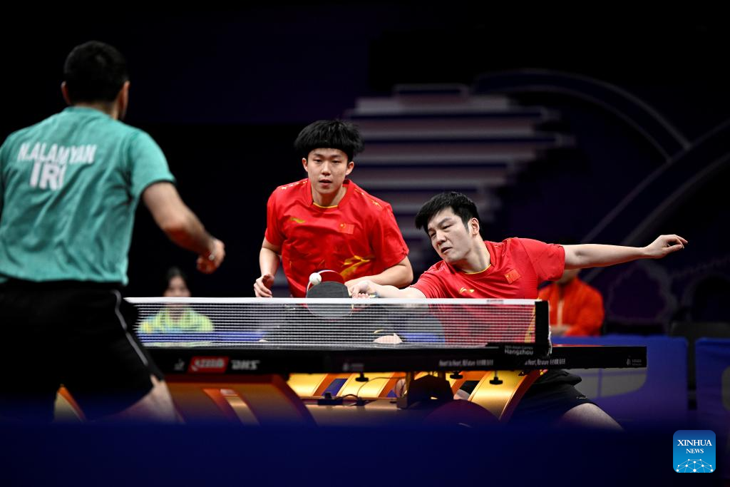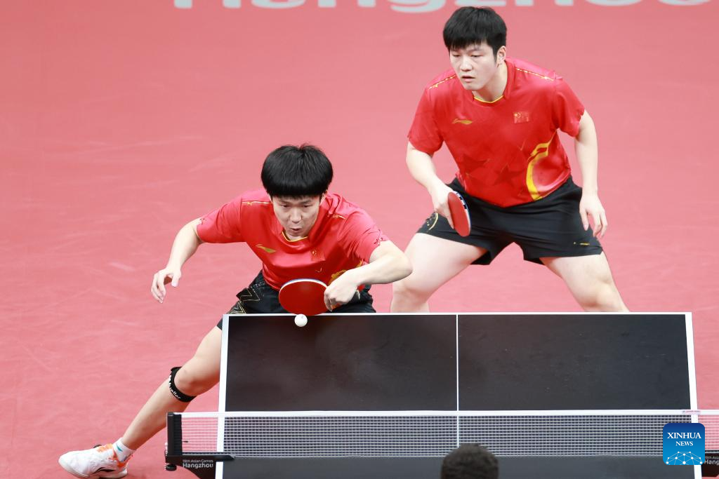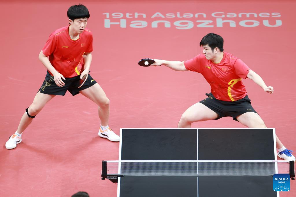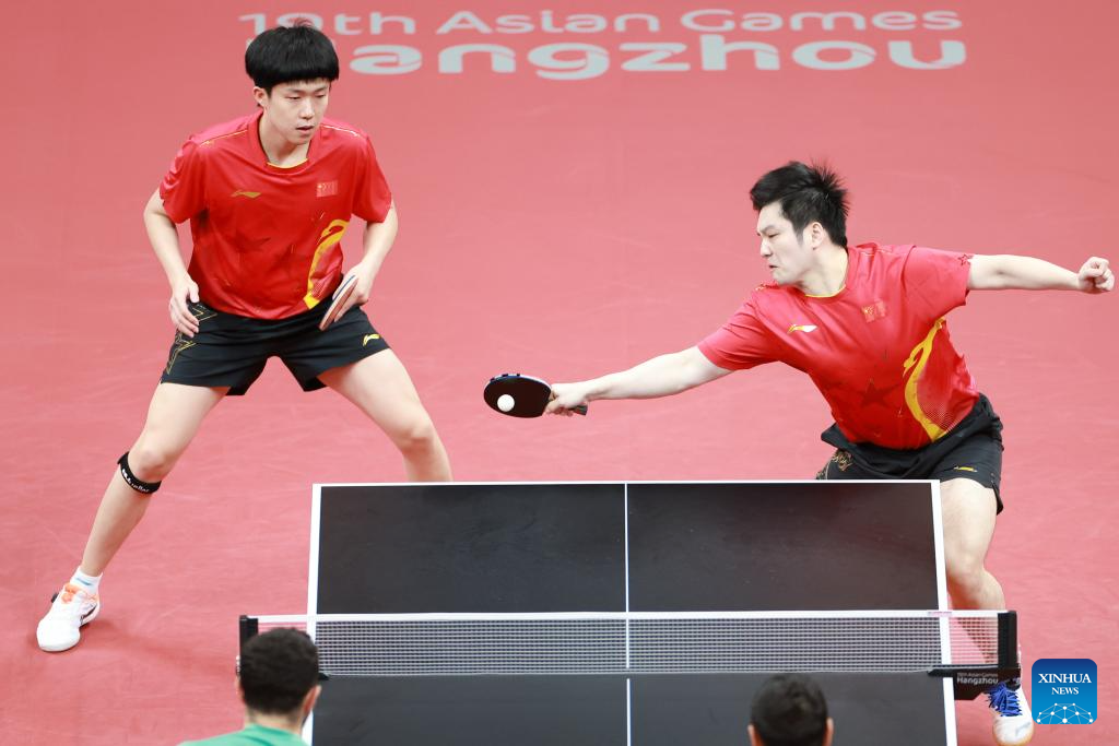 Fan Zhendong (R)/Wang Chuqin of China compete during the Men's Doubles Semifinal of Table Tennis between Fan Zhendong/Wang Chuqin of China and Nima Alamian Darounkolaei/Noshad Alamiyan Daronkolaei of Iran at the 19th Asian Games in Hangzhou, east China's Zhejiang Province, Oct. 1, 2023. (Xinhua/Liu Xu)