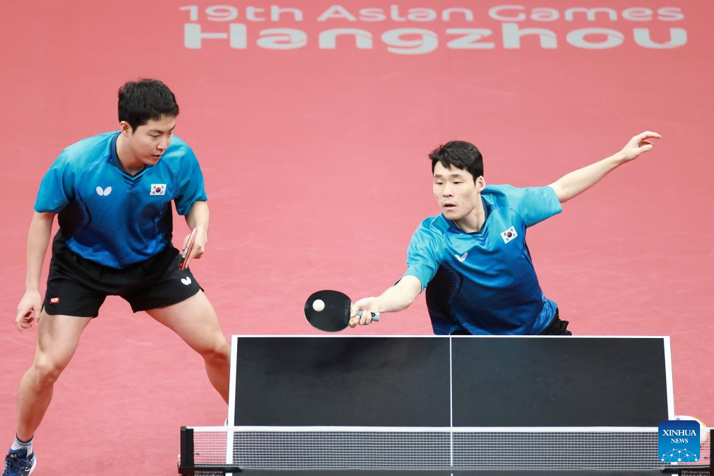 Jang Woojin/Lim Jonghoon (R) of South Korea compete during the Men's Doubles Semifinal of Table Tennis between Jang Woojin/Lim Jonghoon of South Korea and Chuang Chih-Yuan/Lin Yun-Ju of Chinese Taipei at the 19th Asian Games in Hangzhou, east China's Zhejiang Province, Oct. 1, 2023. (Xinhua/Liu Xu)