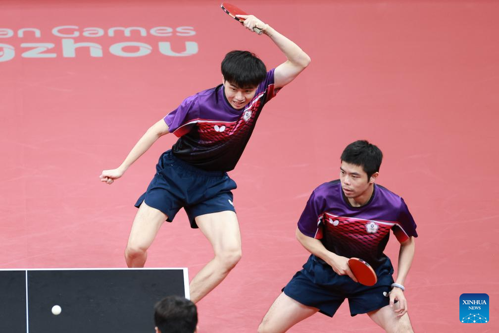 Chuang Chih-Yuan (R)/Lin Yun-Ju of Chinese Taipei compete during the Men's Doubles Semifinal of Table Tennis between Jang Woojin/Lim Jonghoon of South Korea and Chuang Chih-Yuan/Lin Yun-Ju of Chinese Taipei at the 19th Asian Games in Hangzhou, east China's Zhejiang Province, Oct. 1, 2023. (Xinhua/Liu Xu)