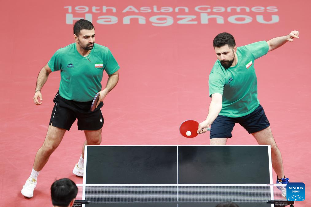 Nima Alamian Darounkolaei (R)/Noshad Alamiyan Daronkolaei of Iran compete during the Men's Doubles Semifinal of Table Tennis between Fan Zhendong/Wang Chuqin of China and Nima Alamian Darounkolaei/Noshad Alamiyan Daronkolaei of Iran at the 19th Asian Games in Hangzhou, east China's Zhejiang Province, Oct. 1, 2023. (Xinhua/Liu Xu)