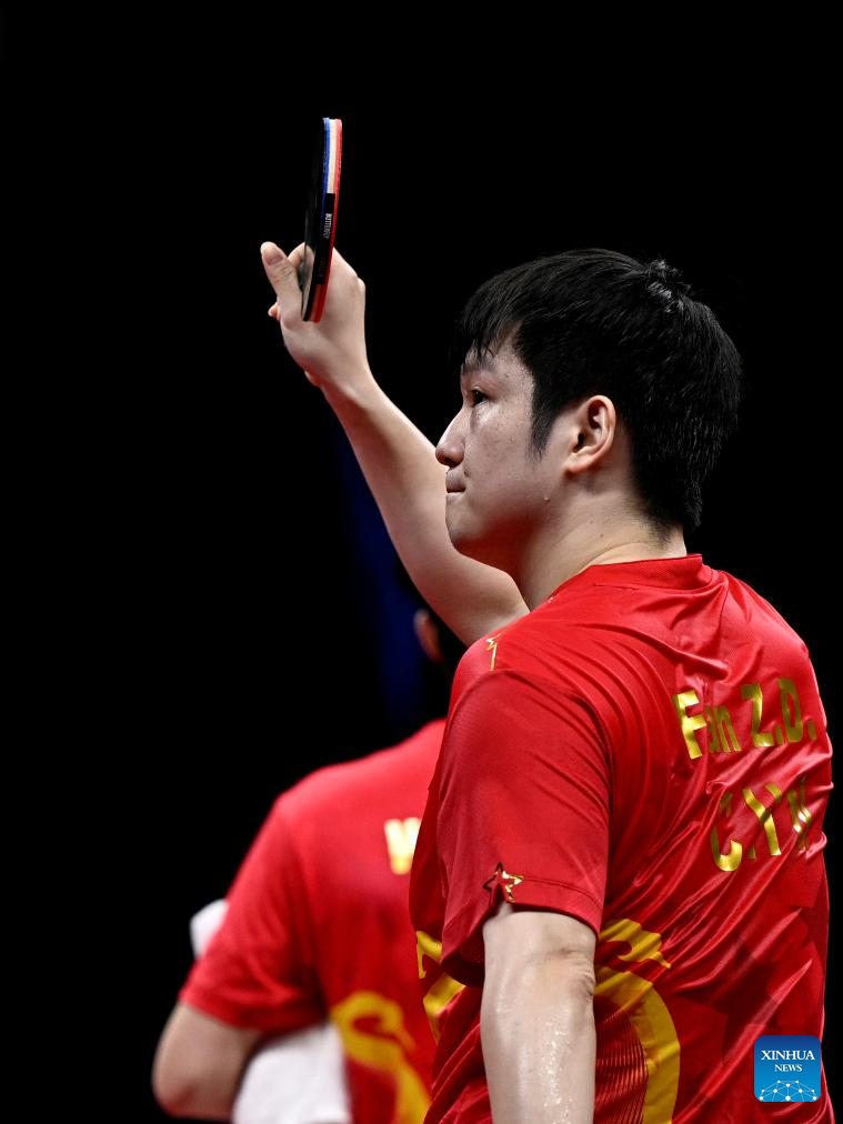 Fan Zhendong (R)/Wang Chuqin of China compete during the Men's Doubles Semifinal of Table Tennis between Fan Zhendong/Wang Chuqin of China and Nima Alamian Darounkolaei/Noshad Alamiyan Daronkolaei of Iran at the 19th Asian Games in Hangzhou, east China's Zhejiang Province, Oct. 1, 2023. (Xinhua/Wang Peng)