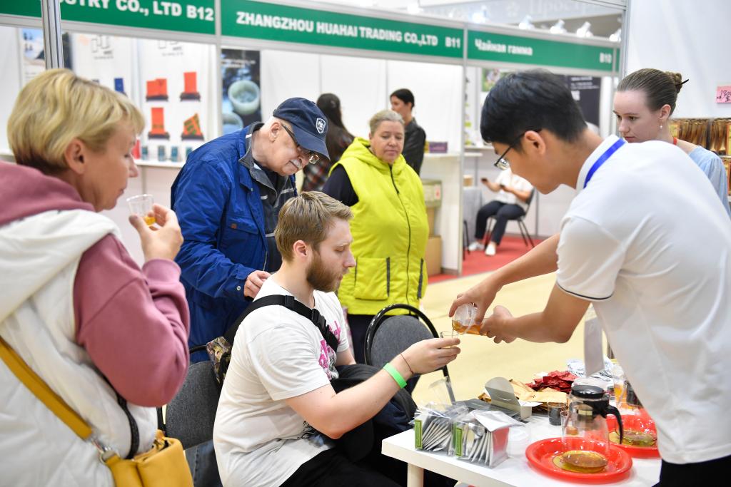 Visitors taste tea at a tea industry expo held in Moscow, Russia, July 14, 2023. (Photo by Alexander Zemlianichenko Jr/Xinhua)