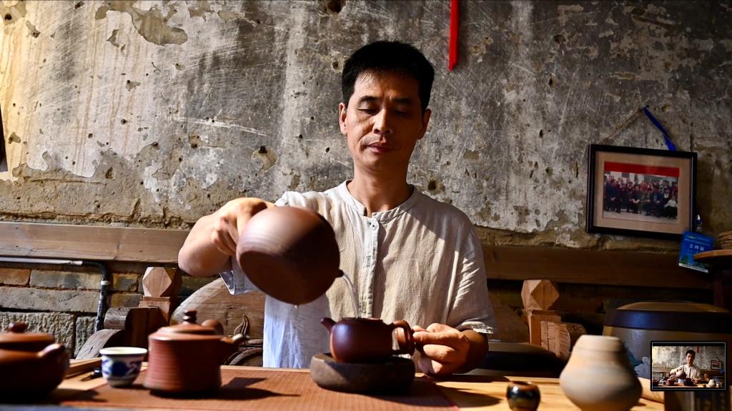 Zou Yingwen, an inheritor of Wuyi Mountains tea-making techniques, makes tea in Xiamei Village, Wuyishan City, southeast China's Fujian Province, Sept. 5, 2023. (Xinhua/Jiang Kehong)