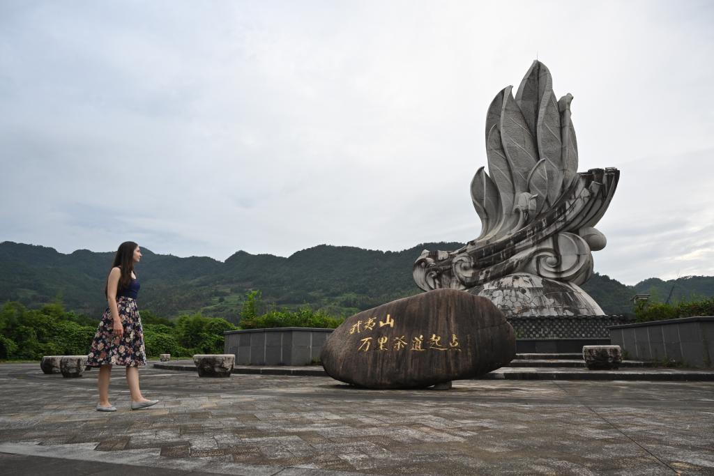 A Xinhua correspondent of Russian nationality visits a sculpture located at the starting point of an ancient tea road in Xiamei Village, Wuyishan City, southeast China's Fujian Province, Sept. 5, 2023. (Xinhua/Jiang Kehong)
