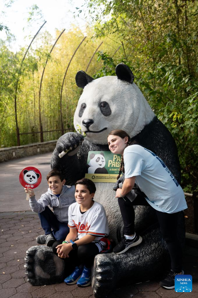 Visitors pose for photos with a giant panda statue at the Smithsonian's National Zoo in Washington, D.C., the United States, Sept. 30, 2023. (Xinhua/Liu Jie)