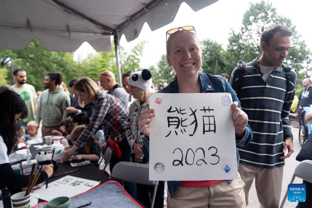 Tourists take part in a Chinese calligraphy writing activity at the Smithsonian's National Zoo in Washington, D.C., the United States, Sept. 30, 2023. (Xinhua/Liu Jie)