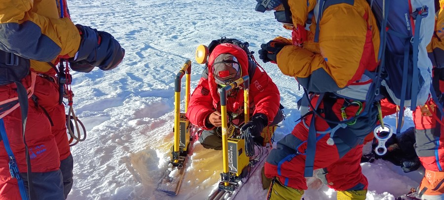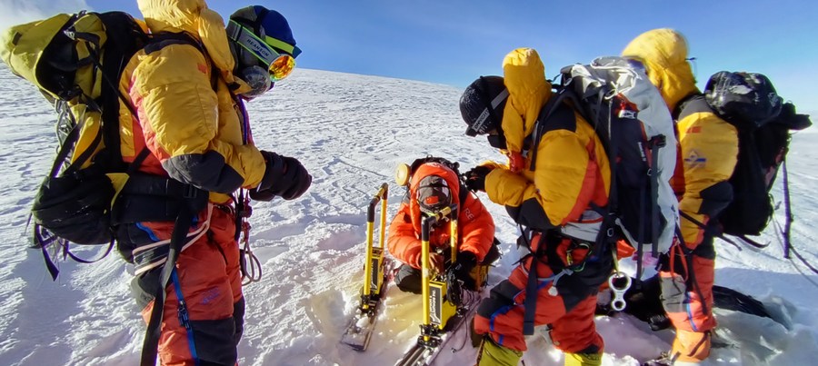 Members of a Chinese expedition team measure the thickness of snow and ice on the summit of Mount Cho Oyu, Oct. 1, 2023. (Xinhua)