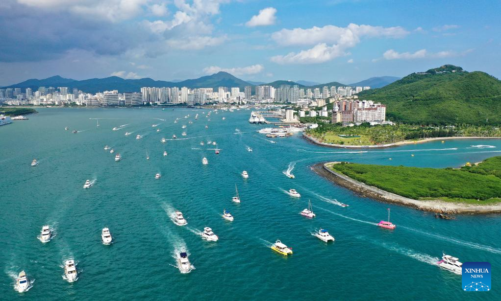 This aerial photo taken on Oct. 1, 2023 shows tourists going sailing in Sanya, south China's Hainan Province. As a popular tourist destination, Sanya is seeing a tourism boom during the National Day holiday. (Xinhua/Guo Cheng)