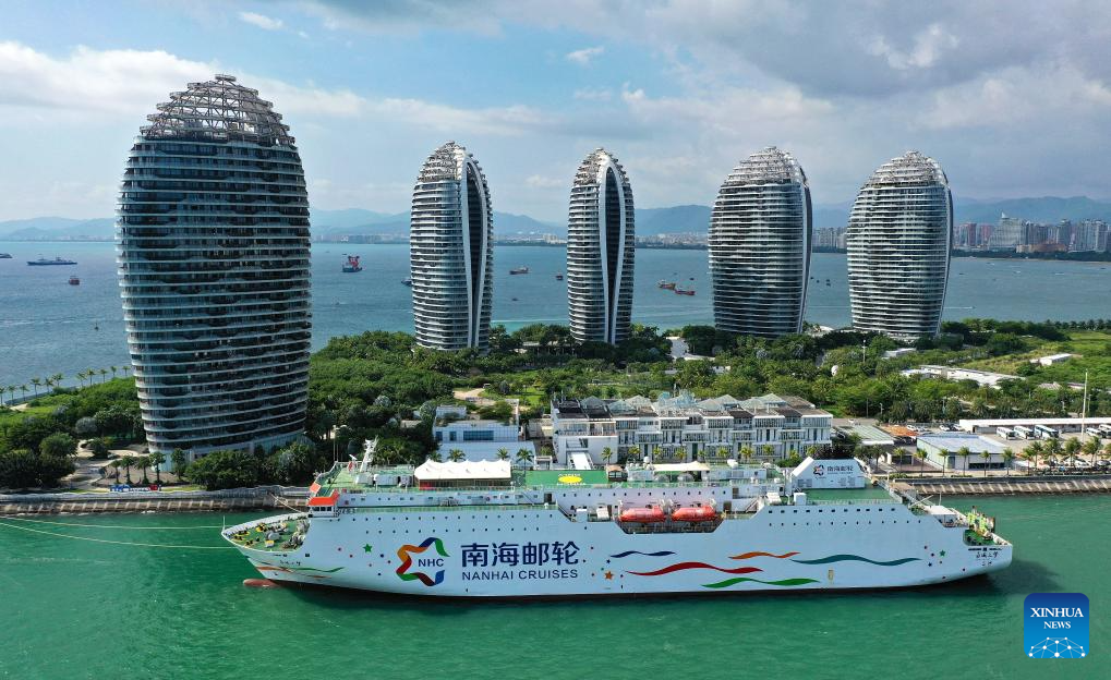 This aerial photo taken on Oct. 1, 2023 shows a cruise ship harboring at a port in Sanya, south China's Hainan Province. As a popular tourist destination, Sanya is seeing a tourism boom during the National Day holiday. (Xinhua/Guo Cheng)