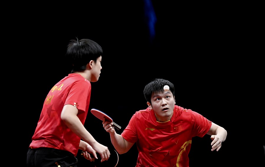 Fan Zhendong (R)/Wang Chuqin of China compete in the men's doubles final. (Xinhua/Wang Peng)