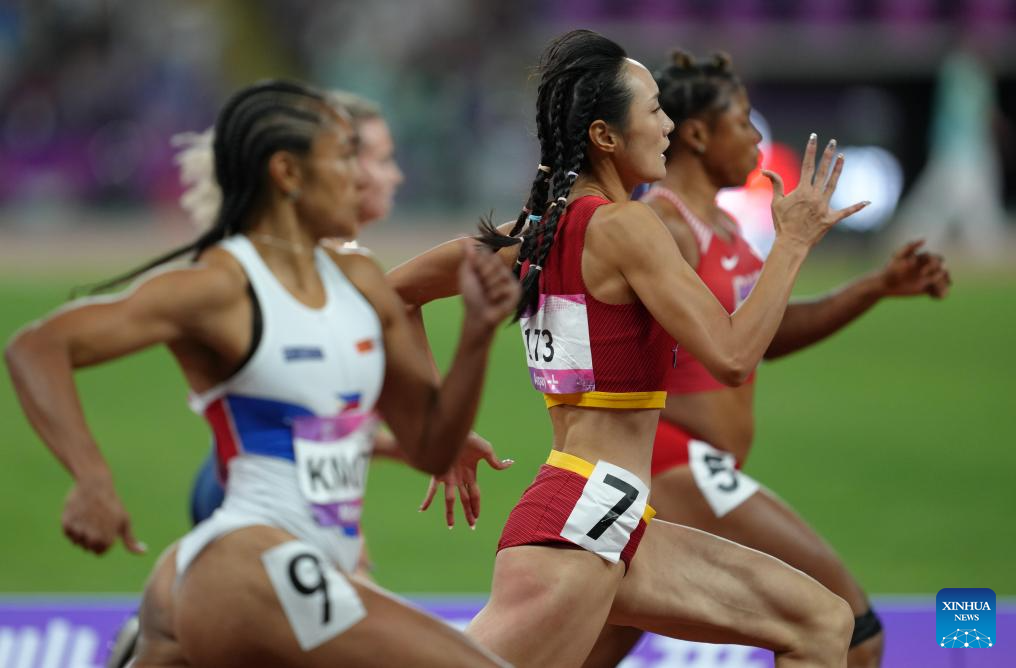 Li Yuting(C) of China competes during the Women's 200m Final of Athletics at the 19th Asian Games in Hangzhou, east China's Zhejiang Province, Oct. 2, 2023. (Xinhua/Jiang Wenyao)
