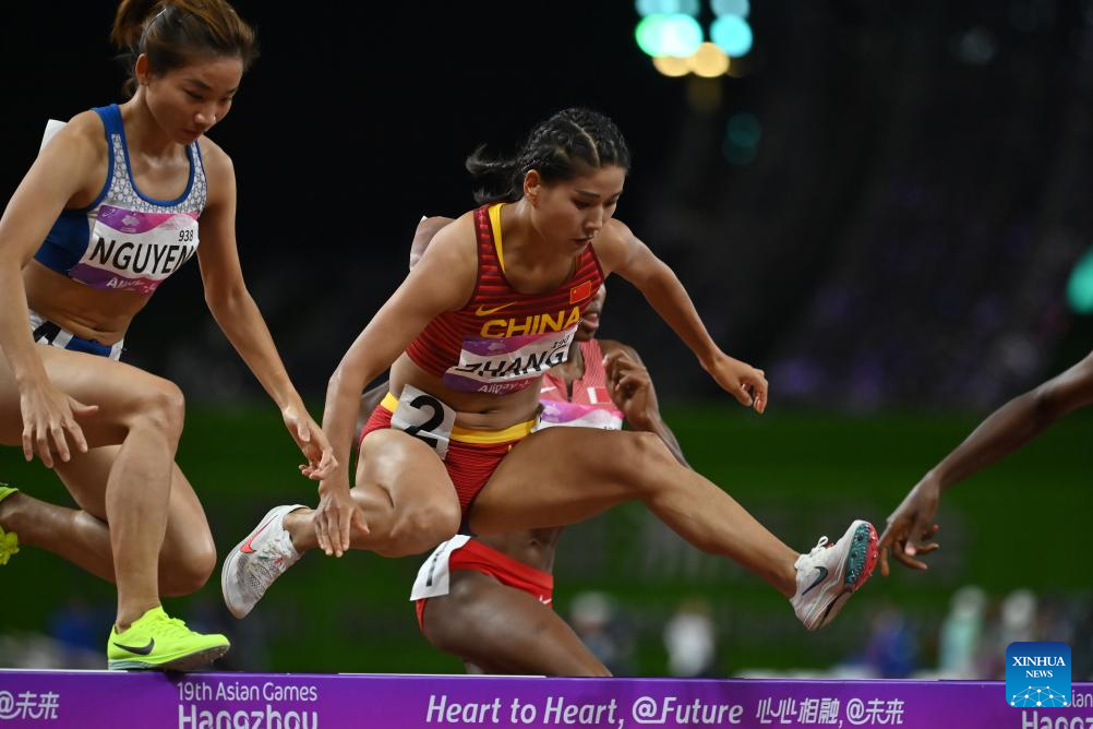 Zhang Xinyan (C) of China competes during the Women's 3000m Steeplechase Final of Athletics at the 19th Asian Games in Hangzhou, east China's Zhejiang Province, Oct. 2, 2023. (Xinhua/Jiang Han)