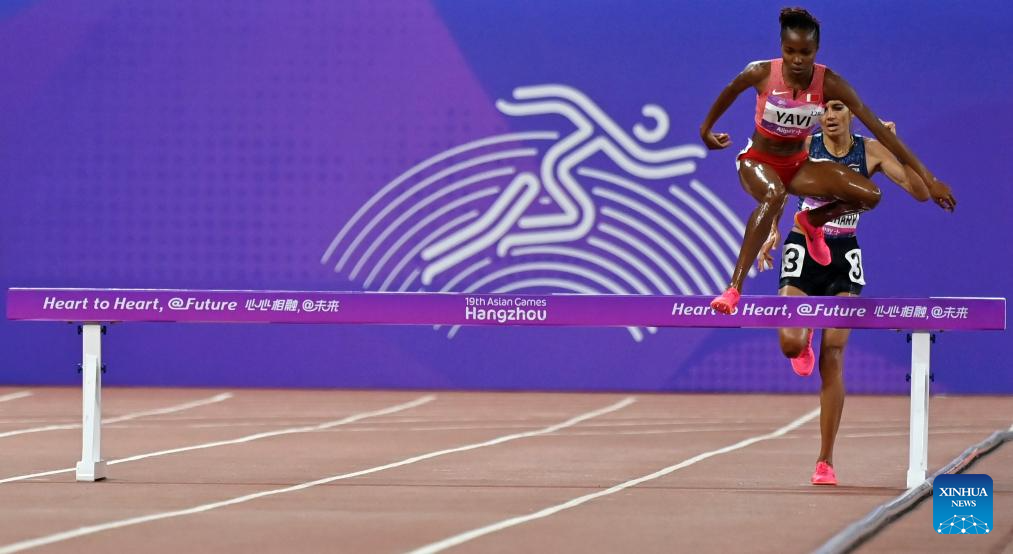 Winfred Mutile Yavi of Bahrain (front) competes during the Women's 3000m Steeplechase Final of Athletics at the 19th Asian Games in Hangzhou, east China's Zhejiang Province, Oct. 2, 2023. (Xinhua/Jiang Han)
