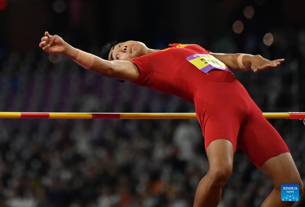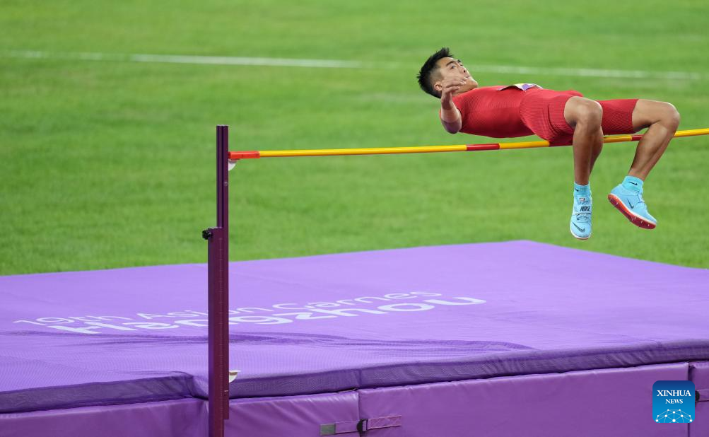 Sun Qihao of China competes during the Men's Decathlon High Jump of Athletics at the 19th Asian Games in Hangzhou, east China's Zhejiang Province, Oct. 2, 2023. (Xinhua/Jiang Han)