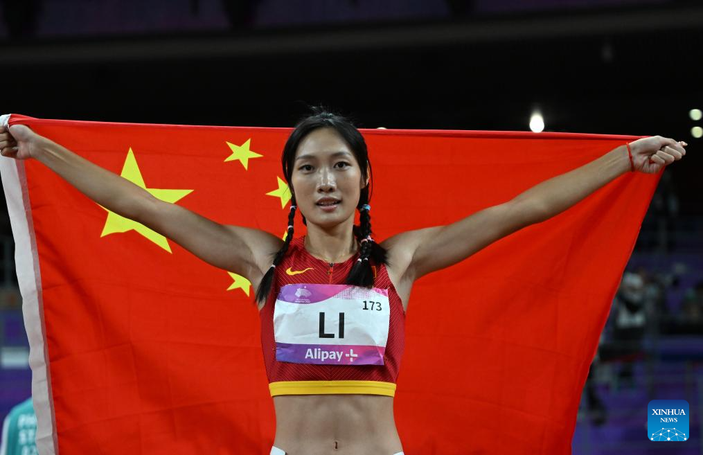 Li Yuting of China reacts after the Women's 200m Final of Athletics at the 19th Asian Games in Hangzhou, east China's Zhejiang Province, Oct. 2, 2023. (Xinhua/Li Yibo)
