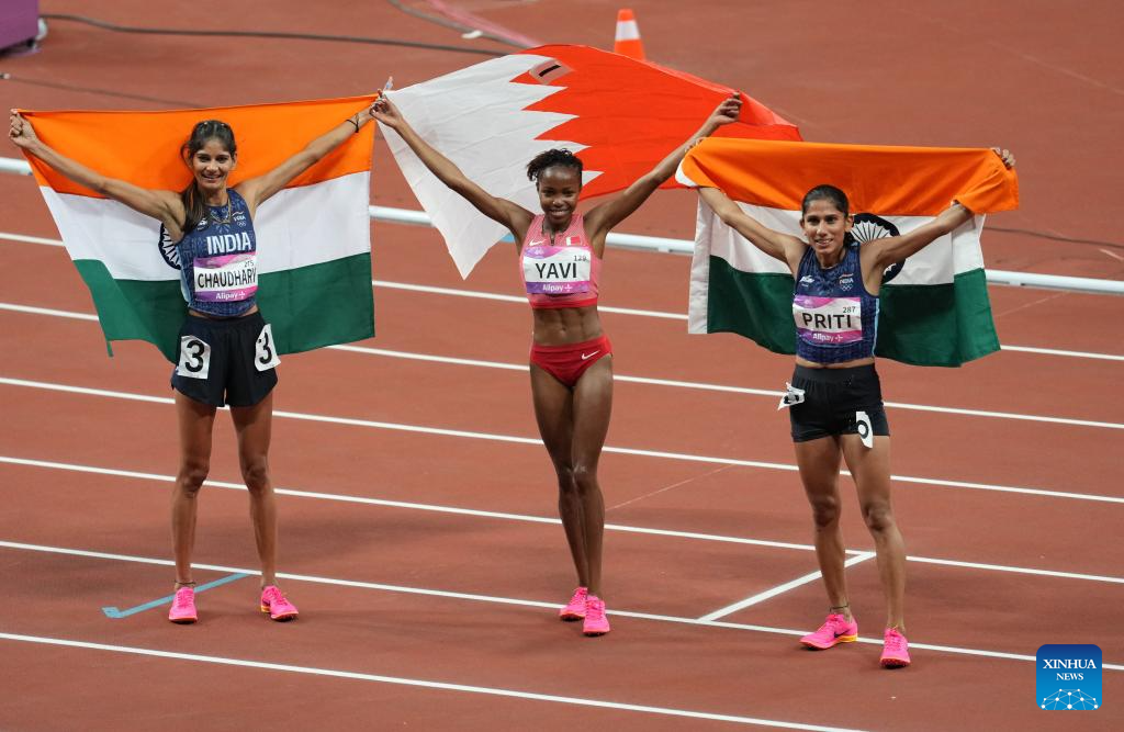 Winfred Mutile Yavi (C) of Bahrain, Parul Chaudhary (L) of India and Priti of India celebrate after the Women's 3000m Steeplechase Final of Athletics at the 19th Asian Games in Hangzhou, east China's Zhejiang Province, Oct. 2, 2023. (Xinhua/Sun Fei)