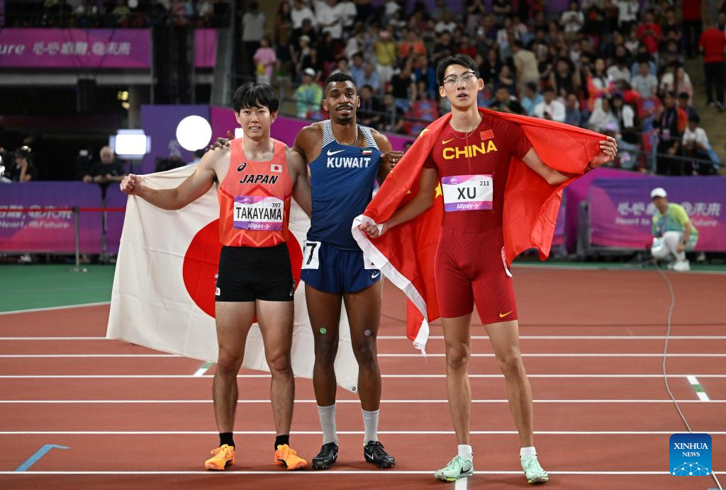 Takayama Shunya(L) of Japan, Yaqoub Alyouha(C) of Kuwait and Xu Zhuoyi of China reacts after the Men's 110m Hurdles Final of Athletics at the 19th Asian Games in Hangzhou, east China's Zhejiang Province, Oct. 2, 2023. (Xinhua/Li Yibo)