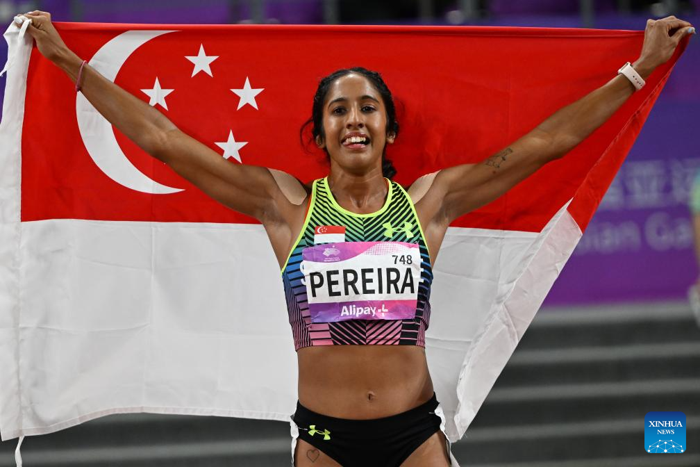 Pereira Veronica Shanti of Singapore reacts after the Women's 200m Final of Athletics at the 19th Asian Games in Hangzhou, east China's Zhejiang Province, Oct. 2, 2023. (Xinhua/Li Yibo)