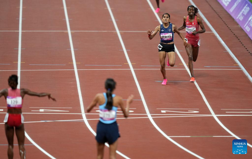 Priti(2nd R) of India and Tigest Getent Mekonen of Bahrain compete during the Women's 3000m Steeplechase of Athletics at the 19th Asian Games in Hangzhou, east China's Zhejiang Province, Oct. 2, 2023. (Xinhua/Sun Fei)
