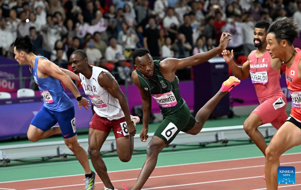 Athletes compete during the Men's 200m Final of Athletics at the 19th Asian Games in Hangzhou, east China's Zhejiang Province, Oct. 2, 2023. (Xinhua/Li Yibo)