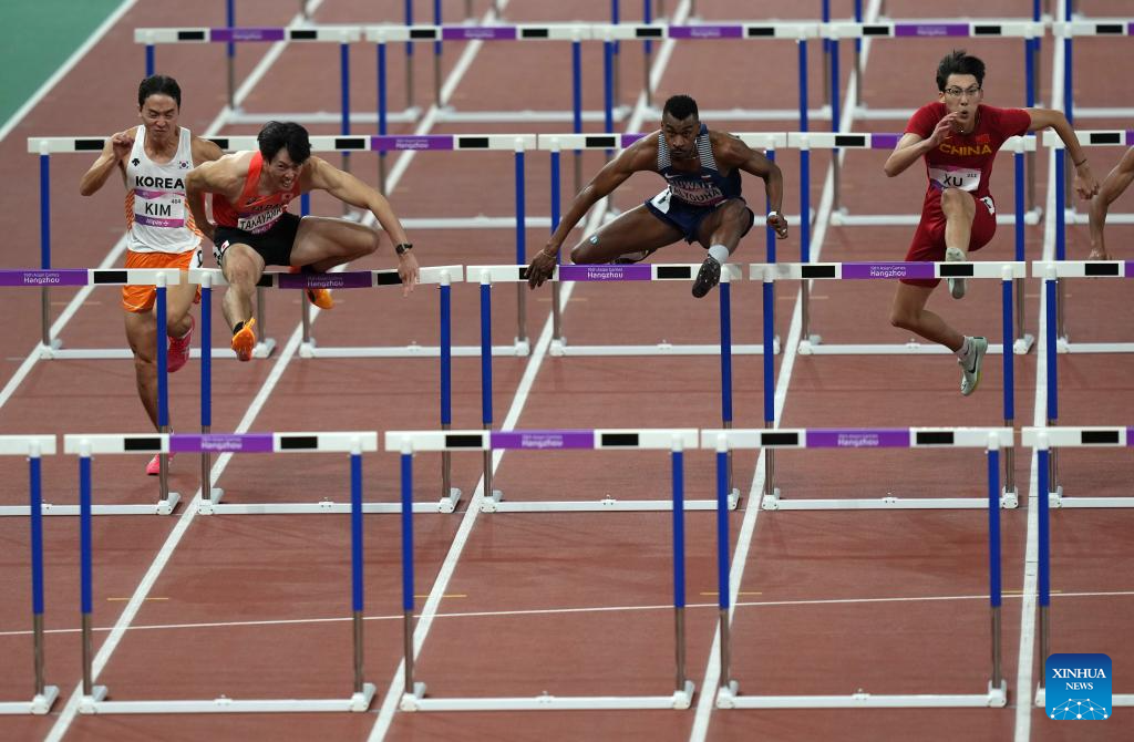 Takayama Shunya(2nd L) of Japan and Yaqoub Alyouha(3rd L) of Kuwait compete during the Men's 110m Hurdles Final of Athletics at the 19th Asian Games in Hangzhou, east China's Zhejiang Province, Oct. 2, 2023. (Xinhua/Sun Fei)