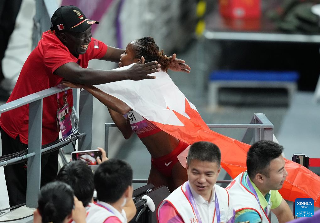 Winfred Mutile Yavi of Bahrain celebrates after the Women's 3000m Steeplechase Final of Athletics at the 19th Asian Games in Hangzhou, east China's Zhejiang Province, Oct. 2, 2023. (Xinhua/Sun Fei)