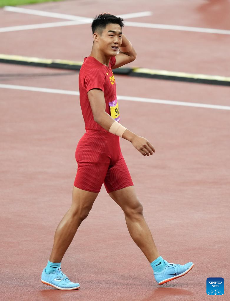 Sun Qihao of China reacts during the Men's Decathlon High Jump of Athletics at the 19th Asian Games in Hangzhou, east China's Zhejiang Province, Oct. 2, 2023. (Xinhua/Sun Fei)