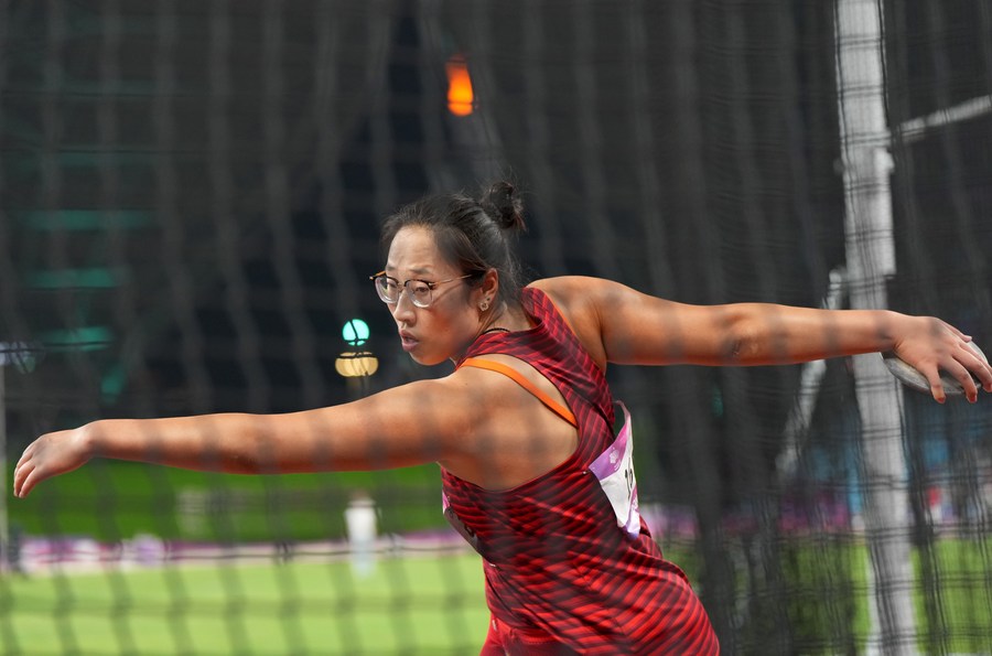 Feng Bin of China competes in the women's discus throw final at the Hangzhou Asian Games on Oct. 1, 2023. (Xinhua/Li Yibo)