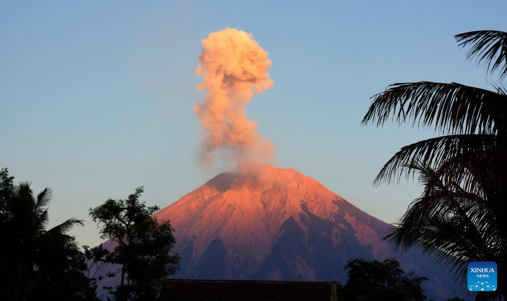 This photo taken on Oct. 1, 2023 shows volcanic materials spewing from Mount Semeru, as seen from Lumajang, East Java, Indonesia. (Photo by Dwi Sasongko/Xinhua)