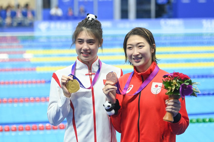 Zhang Yufei (L) of China and Rikako Ikee of Japan pose for photos after the award ceremony of the women's 50m butterfly on Sept. 29, 2023. (Xinhua/Huang Zongzhi)