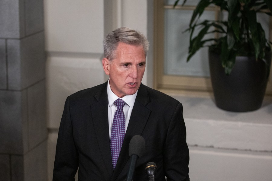 File photo taken on Sept. 29, 2023 shows the U.S. House Speaker Kevin McCarthy speaking to the media in Washington, D.C., the United States. The Republican-controlled House of Representatives on Tuesday approved a motion to oust Speaker Kevin McCarthy in an unprecedented move amid Republican infighting, after McCarthy relied on Democratic votes to pass a "clean" stopgap funding bill to avert a federal government shutdown. (Photo by Aaron Schwartz/Xinhua)