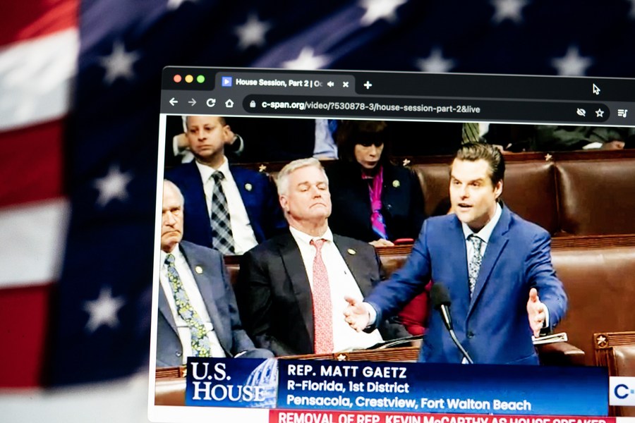 Photo taken on Oct. 3, 2023 in Arlington, the United States, shows a screen displaying Republican Representative Matt Gaetz (Front) speaks before the U.S. House of Representatives voting on a motion to oust Speaker Kevin McCarthy at Capitol Hill in Washington, D.C., the United States. The Republican-controlled House of Representatives on Tuesday approved a motion to oust Speaker Kevin McCarthy in an unprecedented move amid Republican infighting, after McCarthy relied on Democratic votes to pass a "clean" stopgap funding bill to avert a federal government shutdown. (Xinhua/Liu Jie)