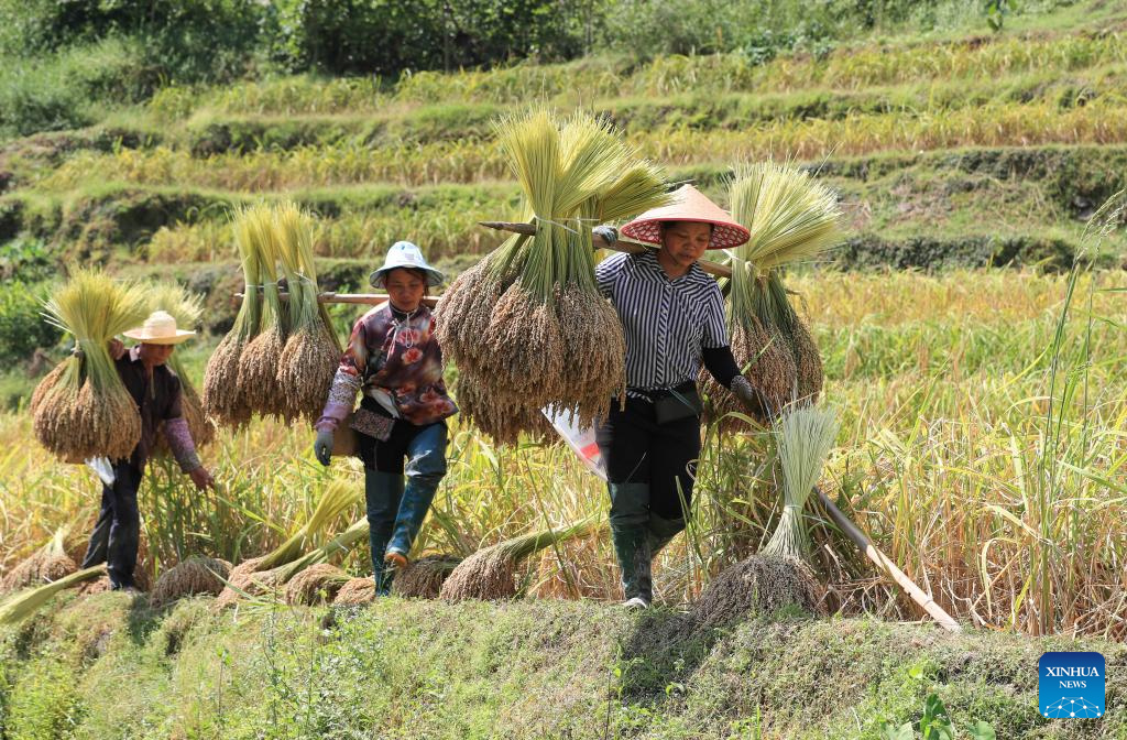 Farmers carry harvested rice in Congjiang County of Qiandongnan Miao and Dong Autonomous Prefecture, southwest China's Guizhou Province, Oct. 4, 2023. (Photo by Luo Jinglai/Xinhua)