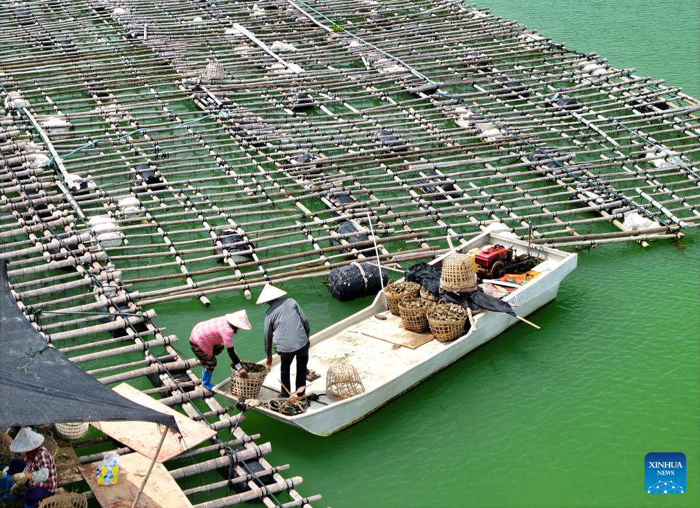 This aerial photo taken on Oct. 4, 2023 shows farmers harvesting oysters in Qinzhou, south China's Guangxi Zhuang Autonomous Region. (Xinhua/Zhou Hua)