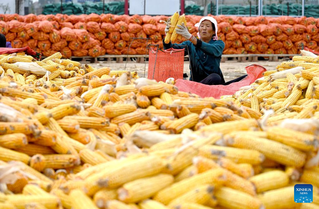A farmer bags corn for airing in Guangping County of Handan, north China's Hebei Province, Oct. 4, 2023. (Photo by Hao Qunying/Xinhua)