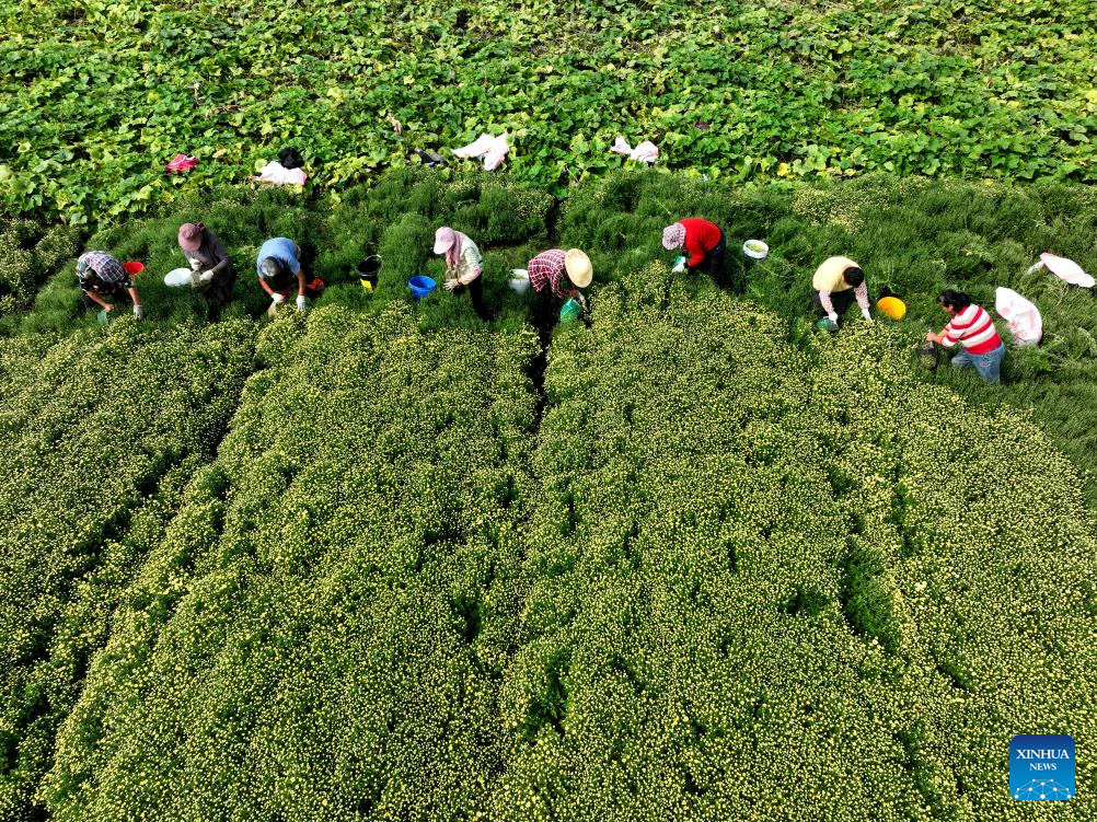 This aerial photo taken on Oct. 4, 2023 shows farmers picking chrysanthemums in Donghong Village of Yancheng, east China's Jiangsu Province. (Photo by Wang Chun/Xinhua)