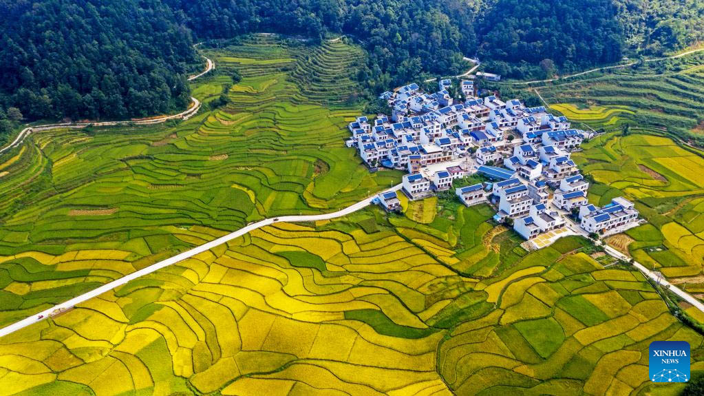 This aerial photo taken on Oct. 4, 2023 shows paddy fields in Dongli Village of Jingxi, south China's Guangxi Zhuang Autonomous Region. (Photo by Zhao Jingwu/Xinhua)