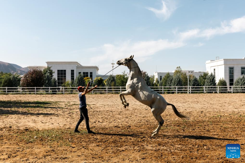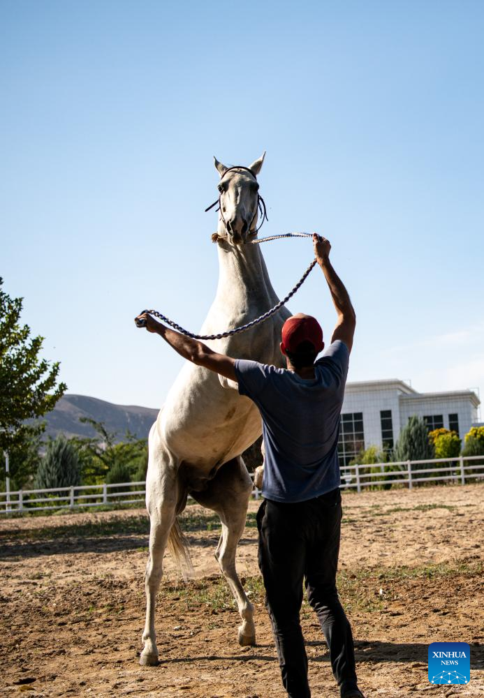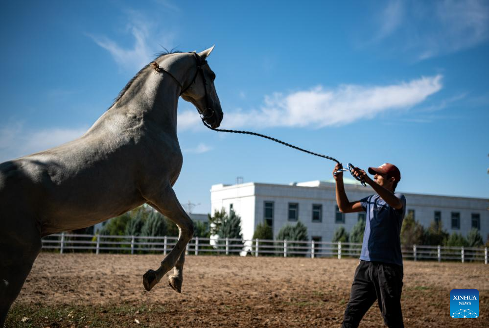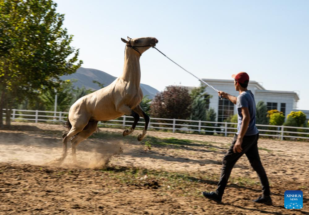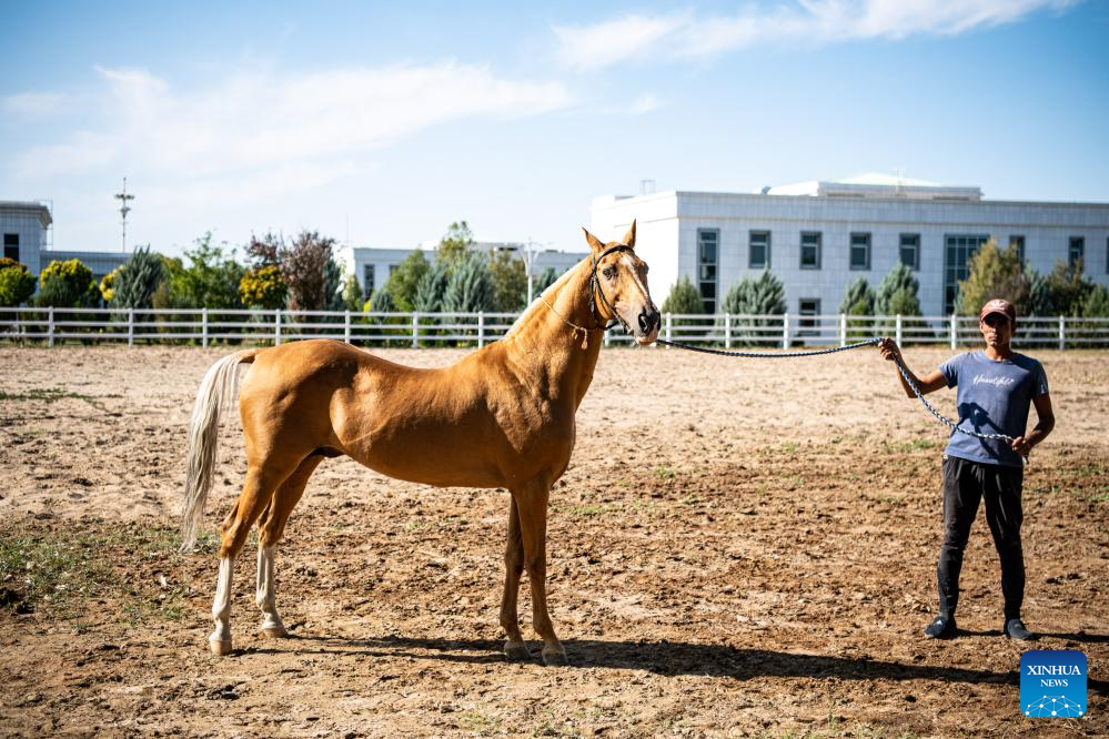 This photo taken on Sept. 26, 2023 shows an Akhal-Teke horse in Ashkhabad, Turkmenistan. Akhal-Teke horse is a national treasure of Turkmenistan and nicknamed "sweat blood horse" in China. (Xinhua/Li Muzi)