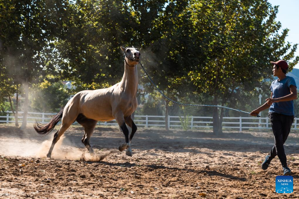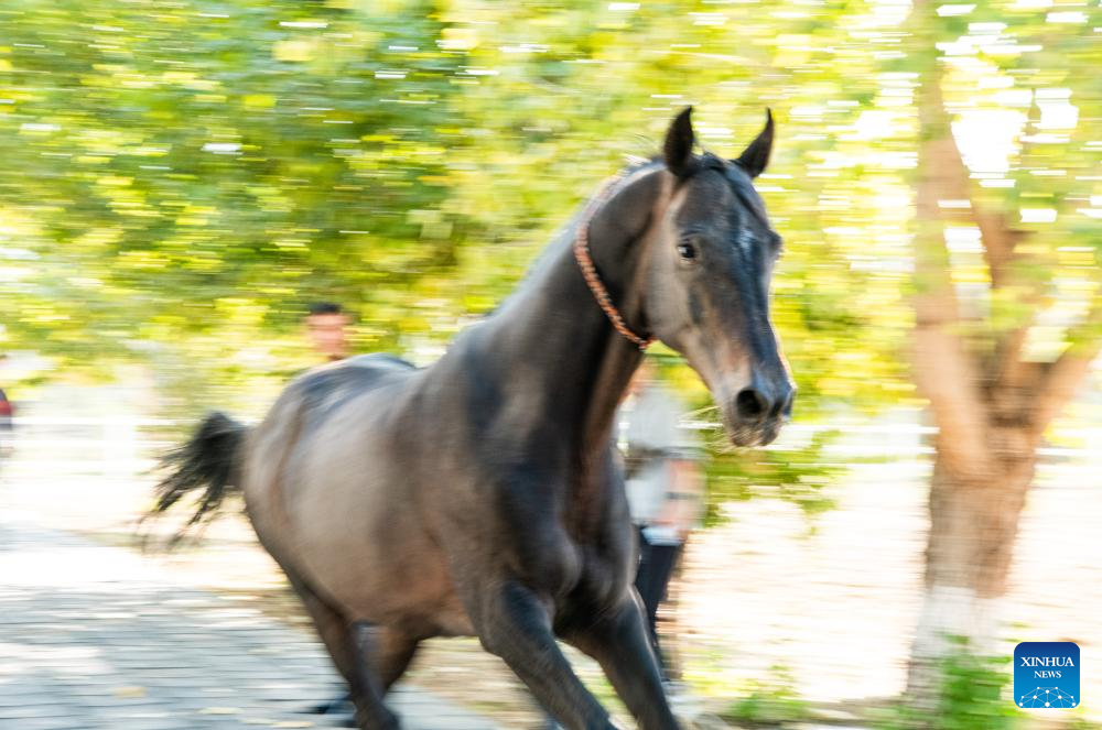 This photo taken on Sept. 26, 2023 shows an Akhal-Teke horse in Ashkhabad, Turkmenistan. Akhal-Teke horse is a national treasure of Turkmenistan and nicknamed "sweat blood horse" in China. (Xinhua/Wu Huiwo)