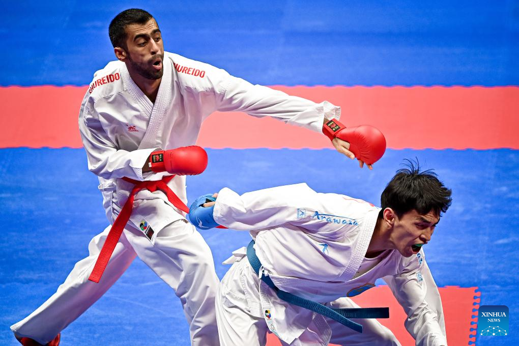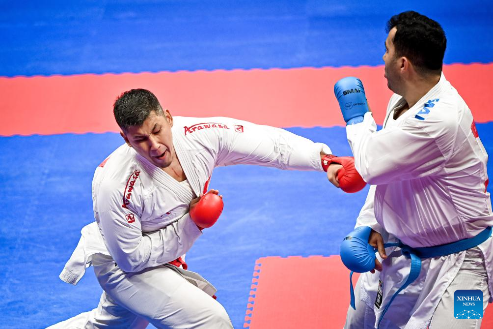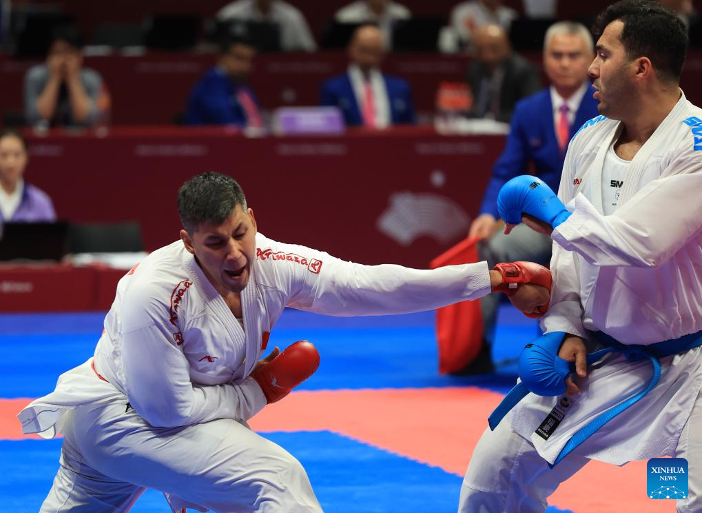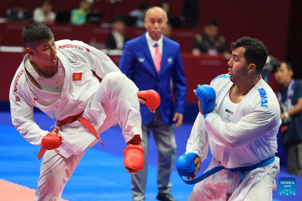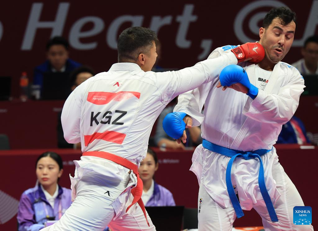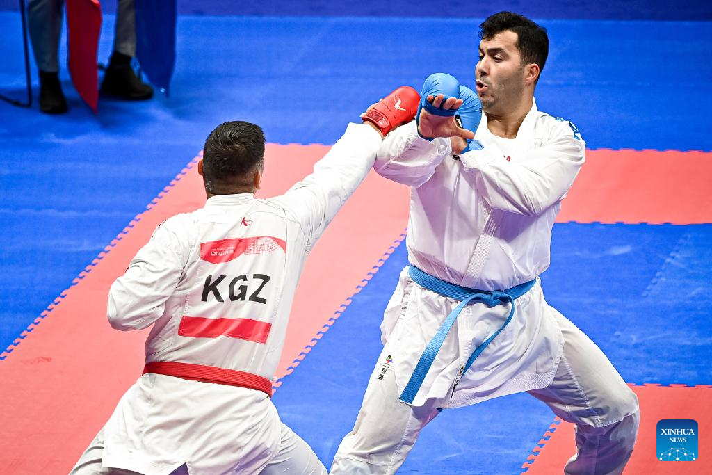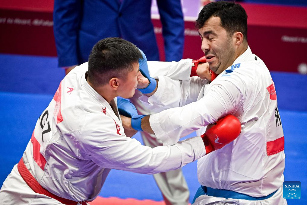 Adilet Shadykanov (L) of Kyrgyzstan competes against Sajad Ganjzadeh of Iran during the Men's Kumite +84kg Gold Medal Contest of Karate at the 19th Asian Games in Hangzhou, east China's Zhejiang Province, Oct. 6, 2023. (Xinhua/Liu Xu)