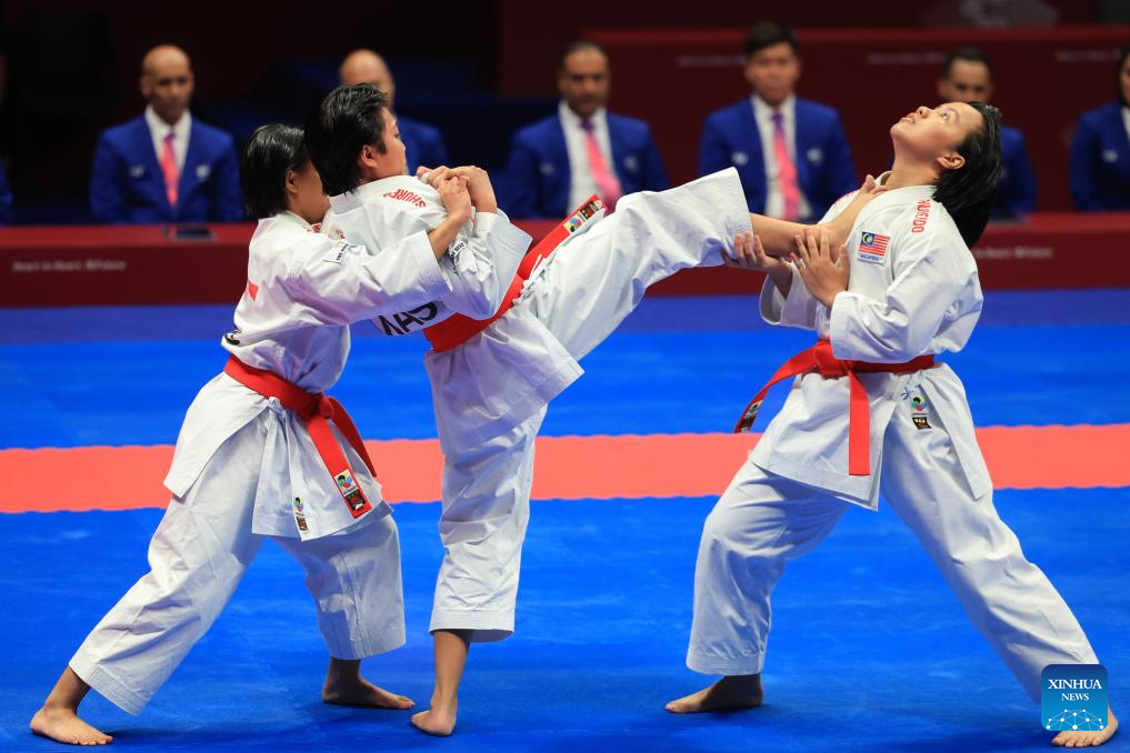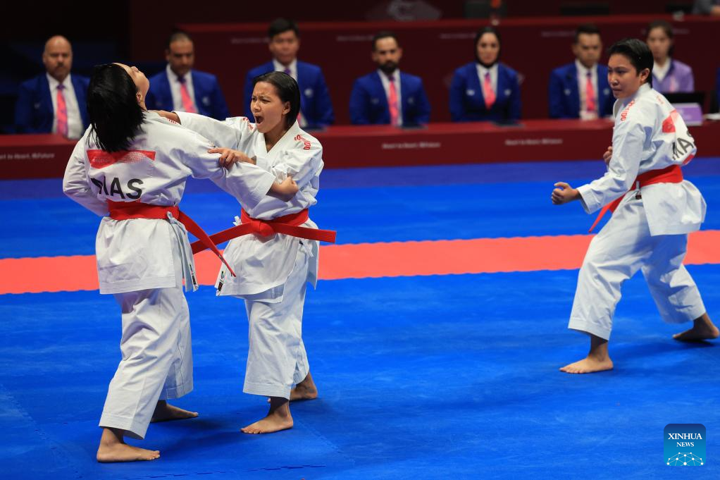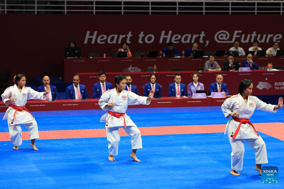 Team Malaysia compete during the Women's Team Kata Gold Medal Contest of Karate at the 19th Asian Games in Hangzhou, east China's Zhejiang Province, Oct. 6, 2023. (Xinhua/Liu Xu)