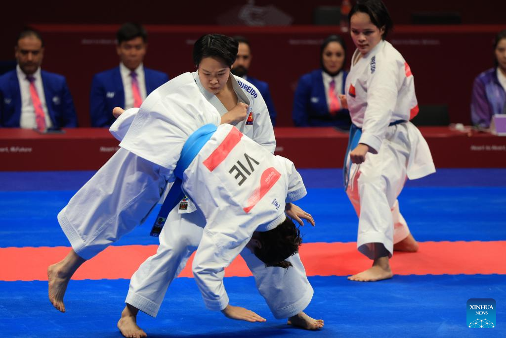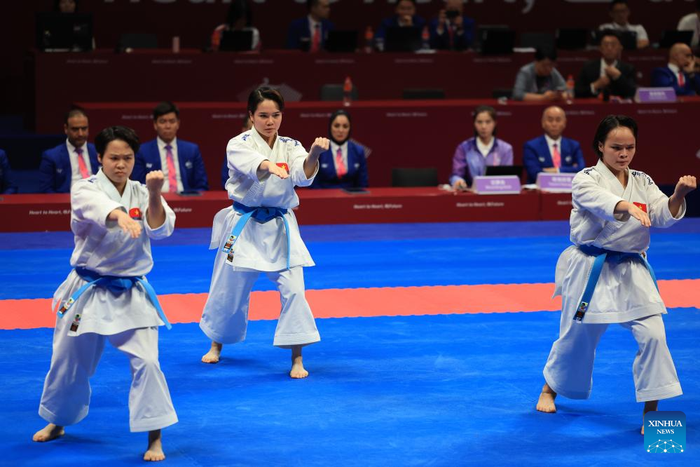 Team Vietnam compete during the Women's Team Kata Gold Medal Contest of Karate at the 19th Asian Games in Hangzhou, east China's Zhejiang Province, Oct. 6, 2023. (Xinhua/Liu Xu)